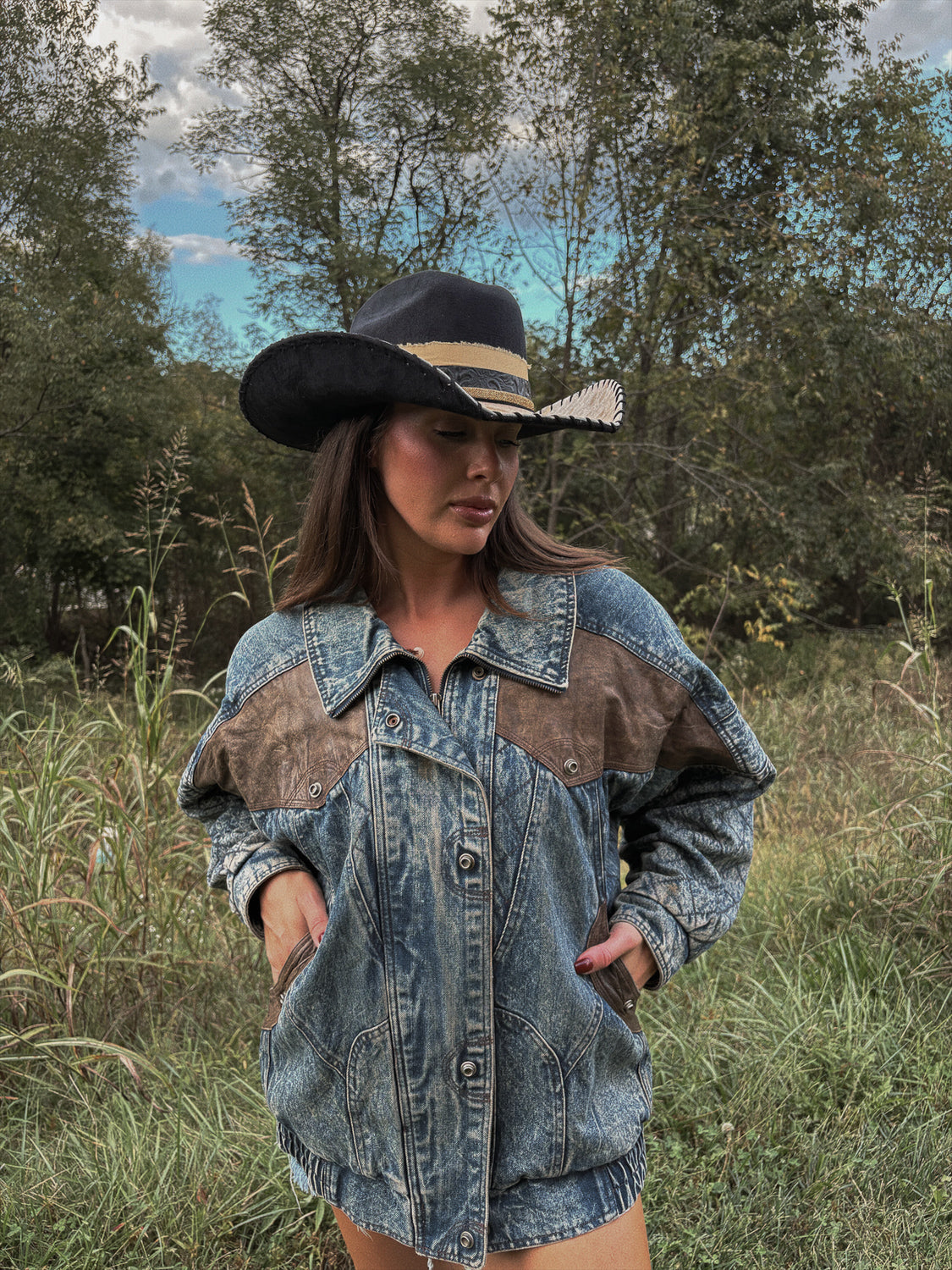 A rare vintage find that blends rugged denim with rich suede yoke detailing. This oversized Western jacket brings that true cowgirl edge — from the rodeo to the honky tonk. Pair it with tall boots or over a mini for a bold, effortlessly cool look.