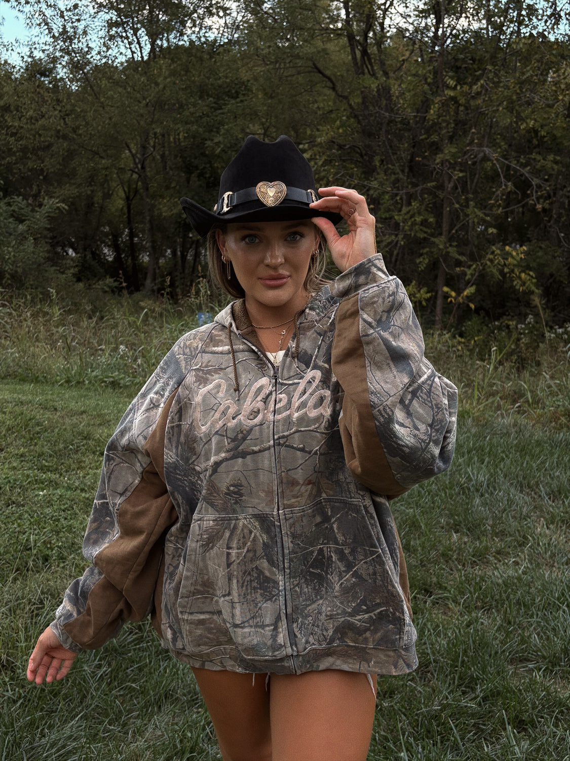 The ultimate cozy camo layer. This vintage Cabela’s hoodie features classic Realtree camo print, soft fleece lining, and front zip closure for laid-back Western comfort. A go-to for bonfires, concerts, or off-duty days with that cool, outdoorsy edge.