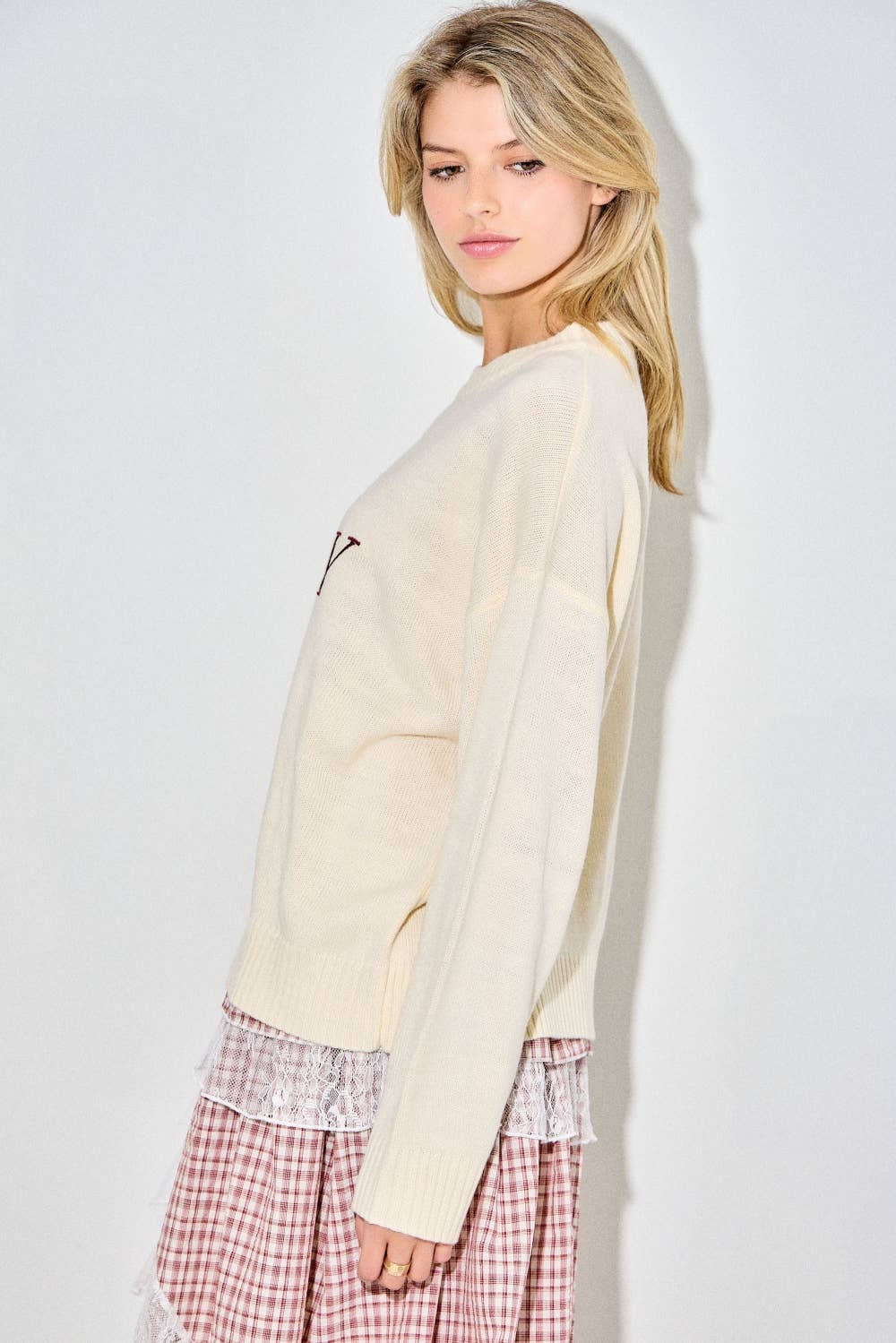Cozy up in this ultra-soft ivory sweater featuring bold red “Kisses Me Cowboy” embroidery across the front. Designed with a classic round neckline, long sleeves, and cuffed hems for that perfect relaxed vibe. Easy to style with denim, skirts, or cutoffs for a flirty western moment.