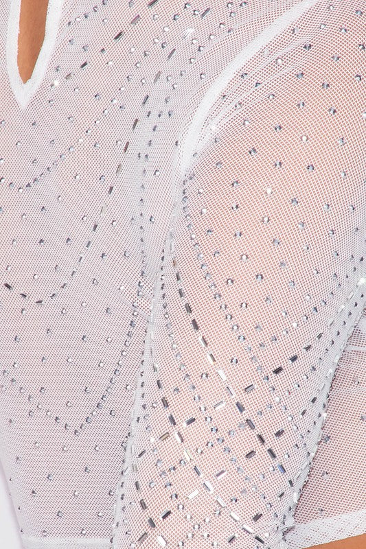 Look fierce in our Carrie Studded Mesh Crop! We love adding a little white sparkle to our fits. Pair with a simple black leather skirt and some heels, or for a festival look pair with sparkle Doja set! Or wear under a graphic tee for added flare!