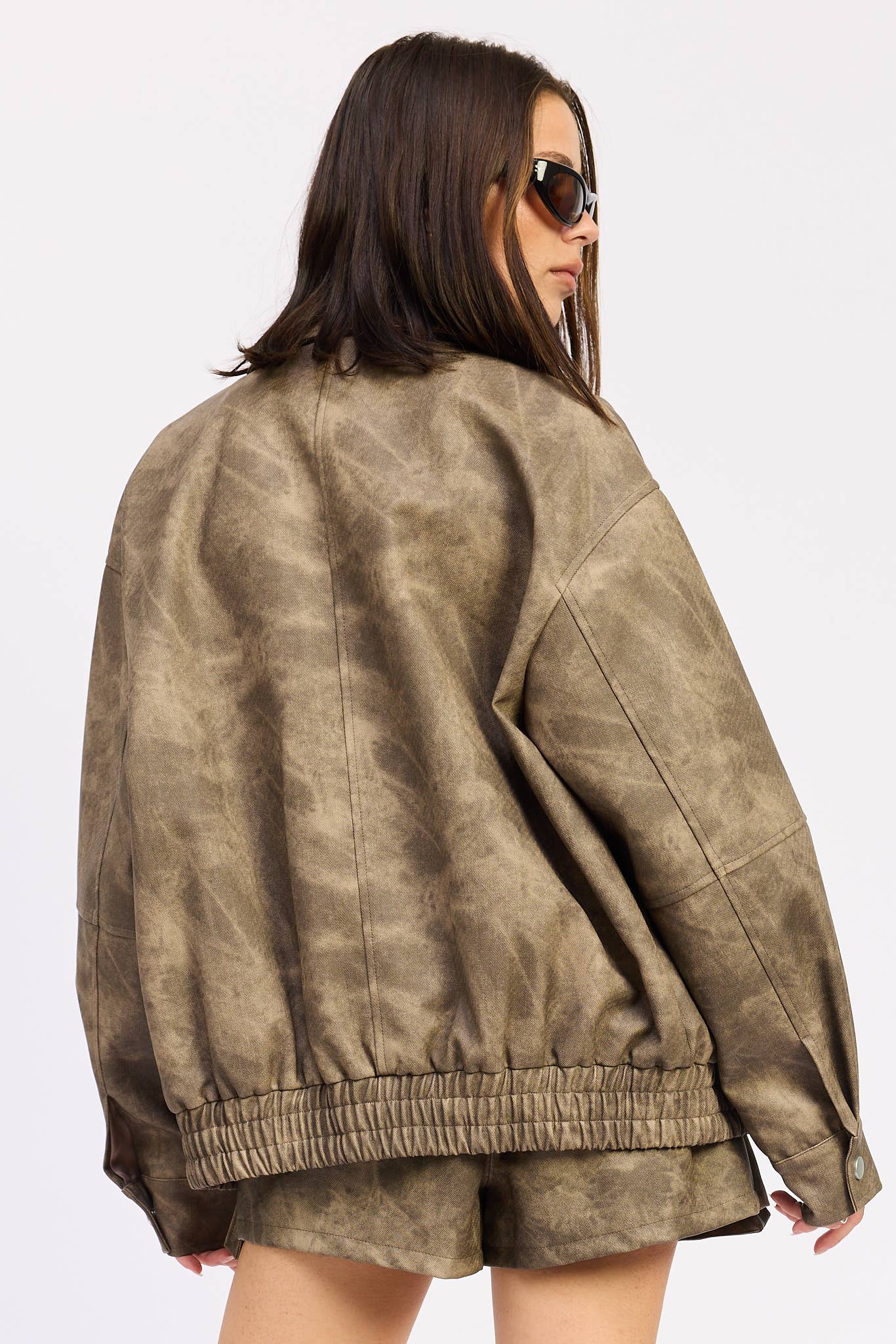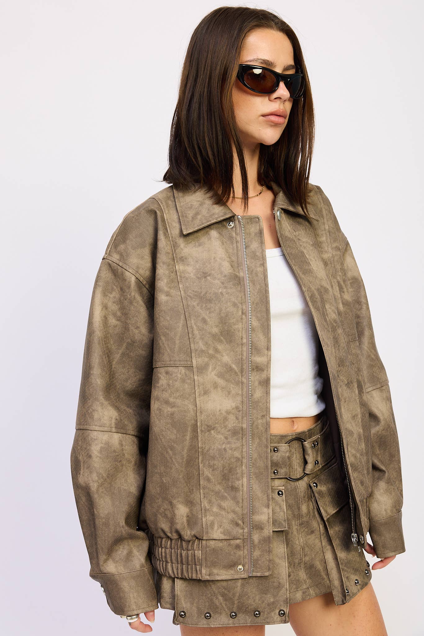 The Stonewash Rebel Bomber Jacket brings a rugged, streetwear-inspired vibe with a western twist. Designed in a washed faux leather finish, this oversized zip-up features bold panel stitching, snap pocket details, and grommet hardware along the hem for an edgy, utilitarian look. The relaxed silhouette makes it easy to layer over crop tops, dresses, or matching skirts for a full statement outfit.